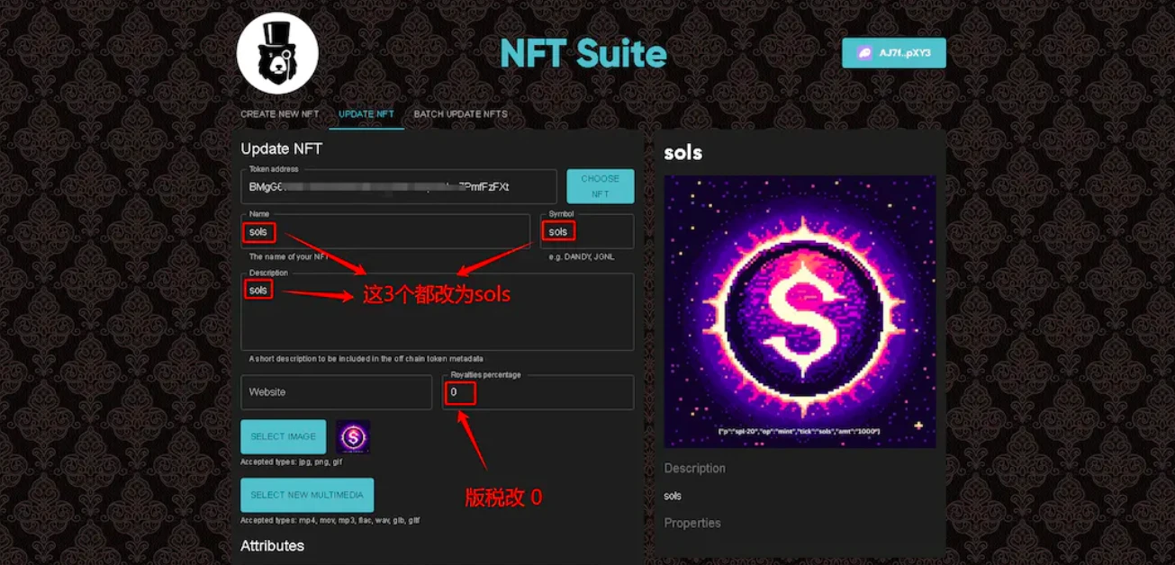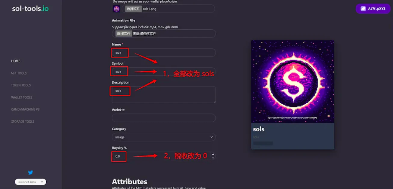 4、下拉,把名称描述特征等,全部改为 sols ,并把版税改为 0