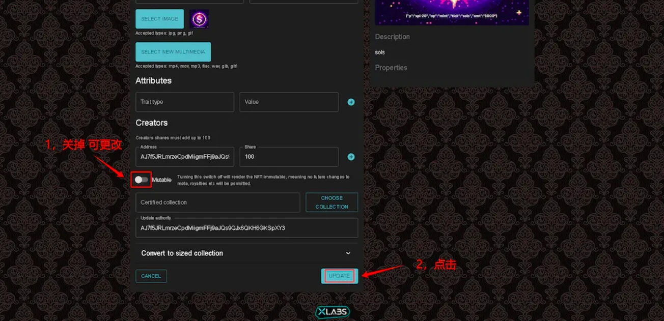 6、下拉,把 Mutable 关掉,并点击 UPDATE