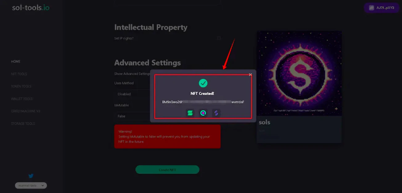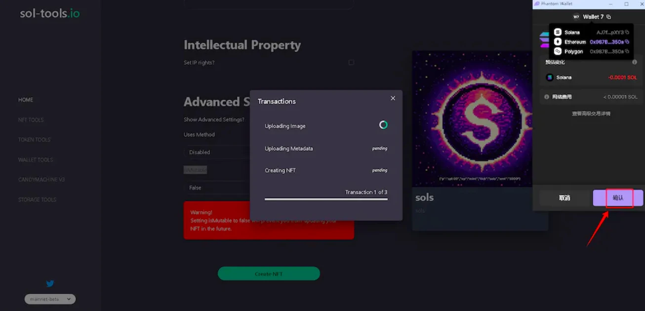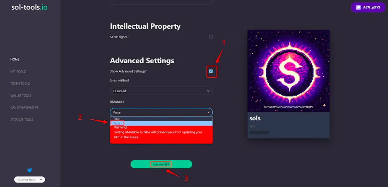 5、继续下拉,勾选高级功能, IsMutable 栏 选择 False,并点击 Create NFT