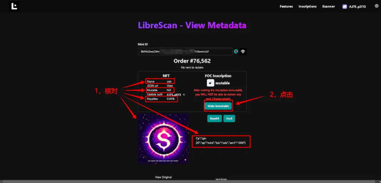 12、铭文信息核对无误后(按照我的截图中为准),多核对几次,出错就进不了有效索引范围内!并点击 Make immutable