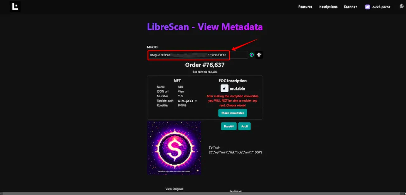8、返回刚复制 MINT DI 的页面,铭文信息核对无误后(按照我的截图中为准),多核对几次,出错就进不了有效索引范围内!并点击 Make immutable