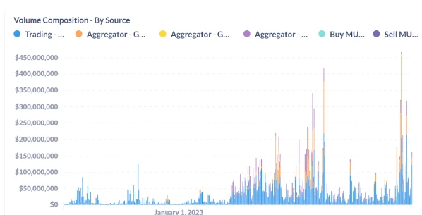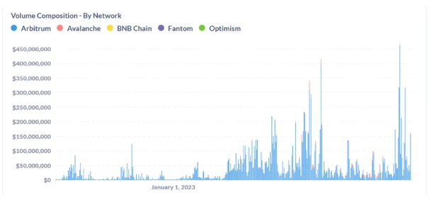 但是实际情况来看,大部分的交易还是发生在 MUX 的原生池子中,特别是 Arbitrum 上的 MUX 池子。如下图, 11 月 7 日,MUX 池子的交易量为$ 123, 392, 194 ,GMX V1为$ 22, 098, 680 , GMX V2为 994, 722 , Gains 为$ 14, 603, 299 ,其它交易占比忽略不计。这说明多链和聚合交易实际对 MUX 的交易量提升不大。