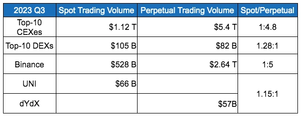 根据 CoinGecko 在 2023 年第三季度的统计数据,前十大中心化交易所(CEX)的现货和衍生品交易量比率为 1: 4.8 ,而在链上却出现了相反的情况。在同一时期,去中心化交易所(DEX)的现货和永续合约交易量比率为 1.28: 1 。
