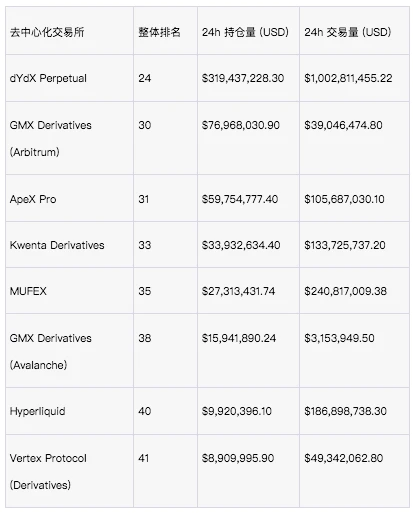 仅仅 2 年的时间,虽然中心化交易所依然占据了合约交易的主导地位,但去中心化衍生品的交易份额增长迅猛。CoinGecko 跟踪了 87 个加密货币衍生品交易所,其中 Binance (Futures)、 Bybit (Futures)和 Deepcoin ( Derivatives )位于前三名,而在 20 ~ 50 名之间不乏去中心化平台的身影。