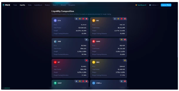 共享多链流动性 - MUX 是一个支持在 Arbitrum、OP、BSC、Avax 和 Fantom 等多条公链上使用的多链项目。与 GMX 不同,MUX 的流动性池(MUXLP)可以跨链共享,当某条公链上的流动性不足时,MUX 协议可以调用其他公链上的流动性来确保交易的执行。