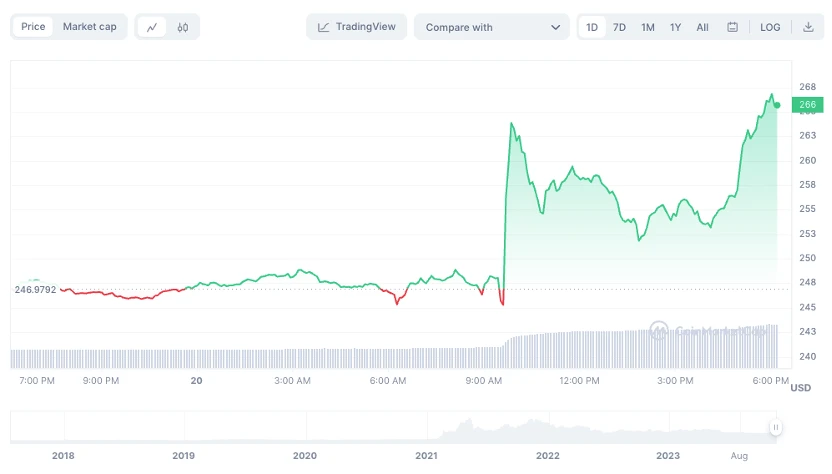 消息放出后, BNB 短时间大涨 ,从 245 美元左右飙升到 263 美元左右,现报 265 美元。