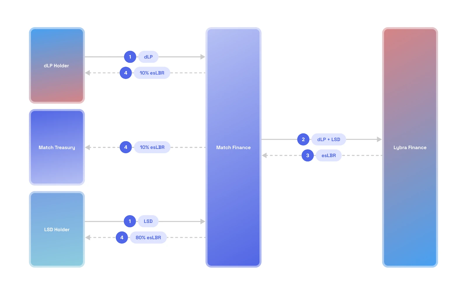 在 Lybra Finance 中,用户必须要求保持持有 eUSC 总价值的 5% 的 LBR/ETH 流动性,才能正常获得 esLBR 奖励,如果无法保持,则原本可以获得的 esLBR 会变成赏金。但在 Match Finance 中,用户只需要存入 eUSD 或则存入 dLP(LBR/ETH 池)就可以获得 esLBR。从而极大的降低了用户获得 esLBR 的门槛,降低风险。
