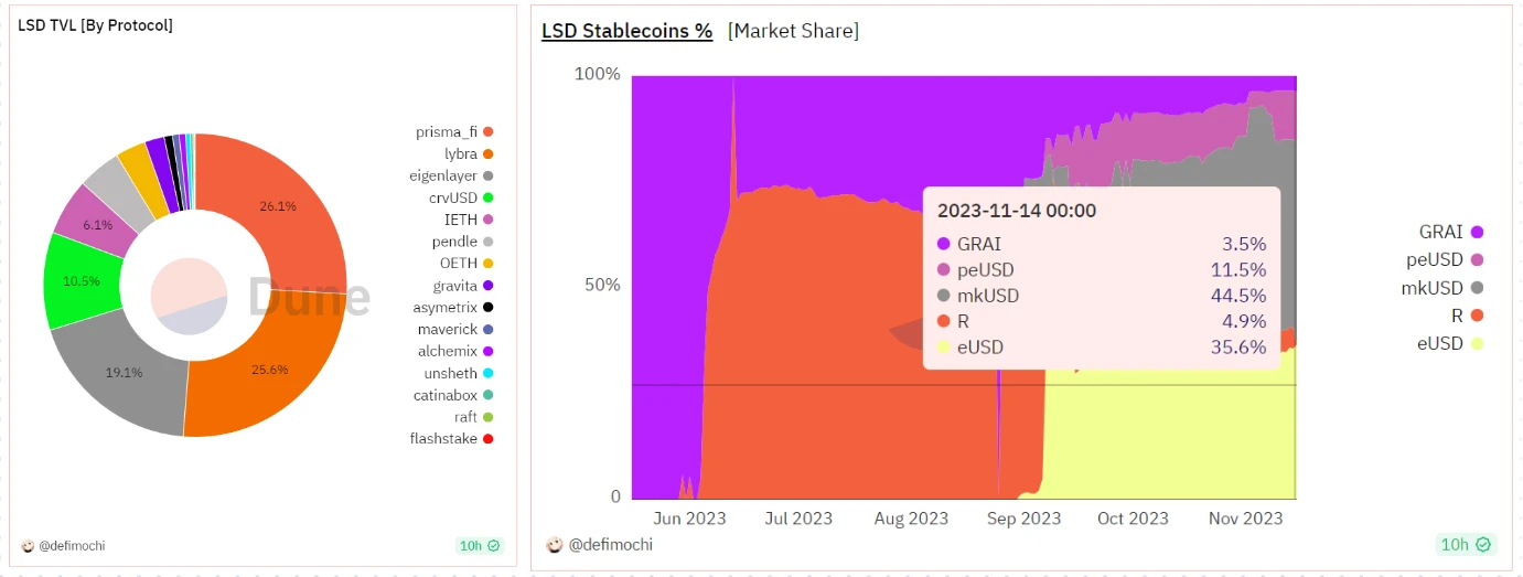 且从数据来看,目前 LSDfi 赛道中 Lybra 占据 25.6% 的份额,其生态稳定币 eUSD 占据总赛道的 35.6% ,均位列前三。