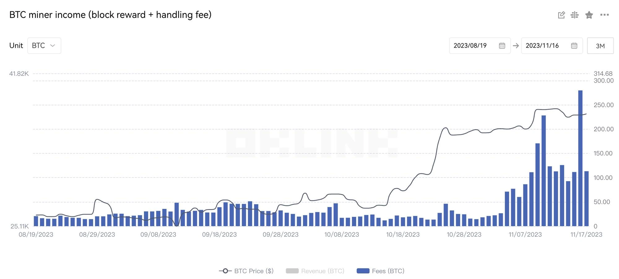 而在矿工利益方面,近期的数据表明,随着像 Ordinals 和 Atomicals 这样的项目的兴起,比特币铭文市场正在经历一场空前的繁荣。根据 oklink 链上大师的数据,在过去三个月中,比特币矿工的收入有显著提高,特别是在 11 月,链上手续费贡献的占比从 8 月 19 日的 2.4% 上升至 11 月 16 日的 23.46% 。这一增长主要得益于 Ordinals 交易对的引入。这表明比特币铭文市场的发展显著提高了矿工手续费收入的比例。预计到 2024 年 4 月的比特币减产时,这一比例可能达到 50% 。