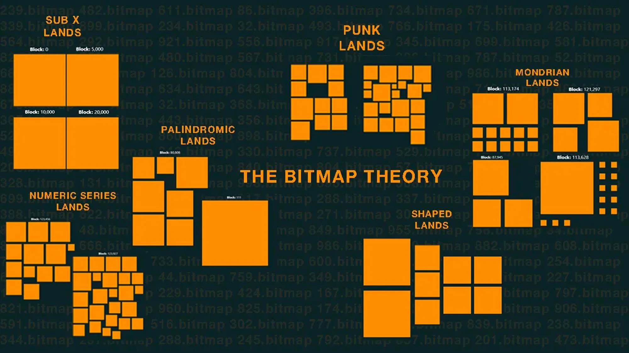 位图理论(Bitmap theory)由推特用户@blockamoto 在 2023 年 6 月 13 日提出。这一理论将比特币区块中的每笔交易输入映射成地块( Parcel ),形成一个街区或区域(District)。不同交易输入的大小差异导致映射出的地块大小也不同。