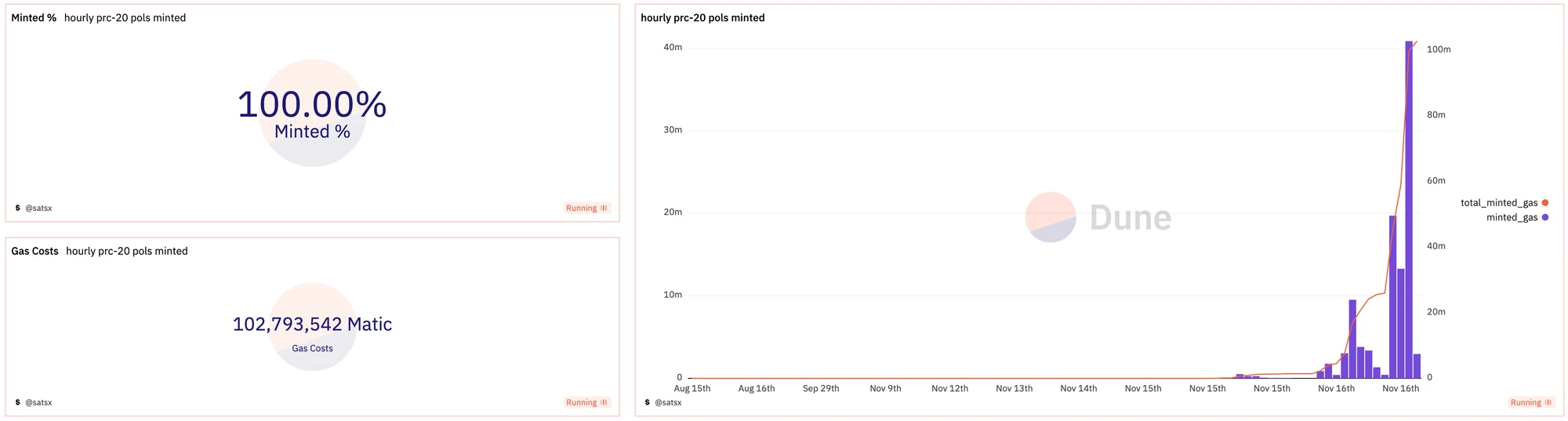 特别是在 11 月 16 日,Polygon 网络的 Gas 费用急剧上升,高达 1800 gwei,原因是社区发现了今年 5 月部署的 PRC-20 标准代币 POLS。根据 evm.link 的数据,POLS 的总发行量为 2100 万张。