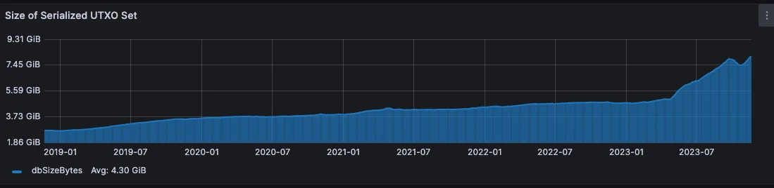 自 BRC 20 开启交易以来(2023 年 4 月),比特币的 UTXO 集已经从 5 GB 膨胀到 8.16 GB,比特币开发社区一直在争论是否要使用技术手段屏蔽铭文交易,铭文交易带来的 UTXO 膨胀正在侵蚀着比特币网络。