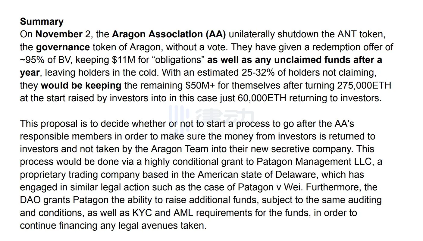 11 月 21 日,据 Aragon DAO 官网显示,Aragon DAO 社区已通过两项投票,支持美国特拉华州的加密交易公司 Patagon Management LLC(后文简称 Patagon)对 Aragon 创始团队提起诉讼,同时也为其提供 30 万枚 USDC,来支持 Patagon 的法律诉讼。