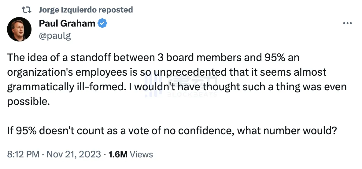 Jorge 转发了 Y combinator 创始人 Paul Graham( @paulg )针对 OpenAI 董事会近日动态的评论,在该条动态中,Paul 认为, 3 名董事会成员和 95% 的员工之间出现对峙的想法是「前所未有」,以至于看起来几乎是错误的:「我根本没想到这样的事情是可能的。如果 95% 不算不信任投票,那么什么数字才算不信任投票呢?」