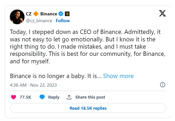 「我犯了错误,我必须承担责任,」 赵长鹏在社交媒体平台 X(前身为Twitter)上写道,「这对我们的社区、币安和我自己都是最好的。」