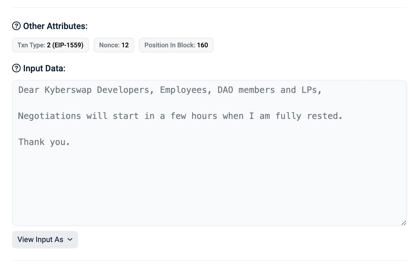 攻击者给协议开发者和 DAO 成员留下了一条链上消息,称“当我休息好后,谈判将在几个小时内开始”。