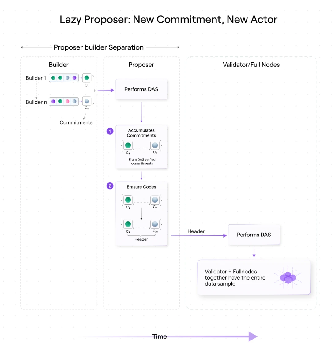 可以有多个构建者创建区块的小块。他们都将这些块发送给一个实体(提议者),该实体对每个部分进行随机抽样,以构建它提出的头部。