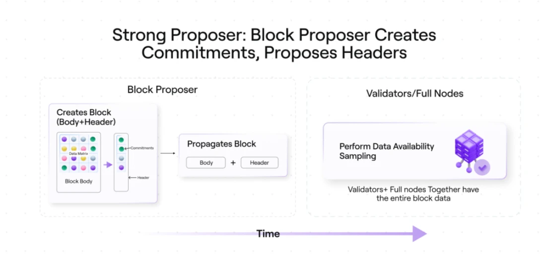 很快,每个人都会拥有对这些数据块的承诺。有了这些承诺,提议者就可以开始随机抽样以确保数据的可用性。通过足够的抽样信心,节点将扩展这些承诺,接受正文中的数据,并构建区块头 —— 从而创建下一个区块。