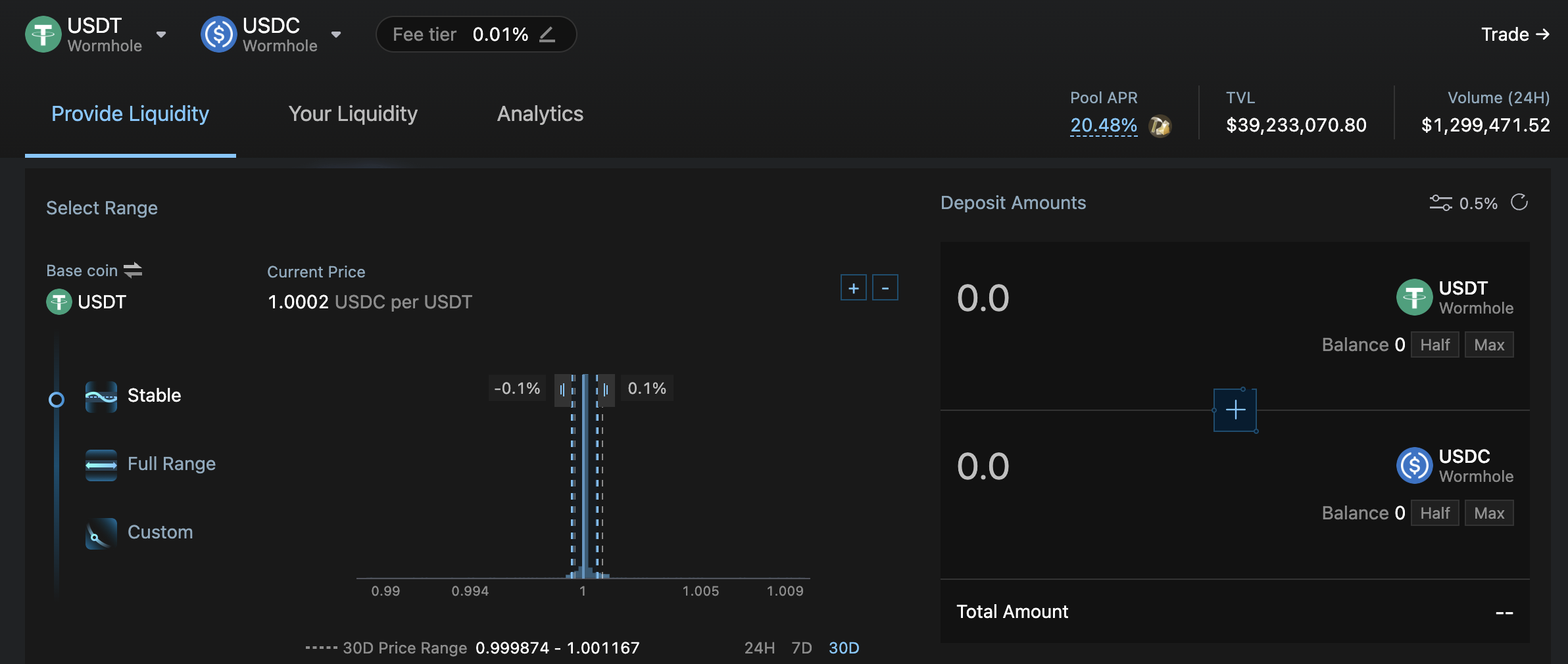 该交易对在 Cetus 上有 3923 万美元的流动性。但要注意 Cetus 允许集中流动性,为了获得更高收益,流动性提供者基本都将流动性集中在相对较窄的范围内,如果 USDC/USDT 价格波动,可能需要调整。