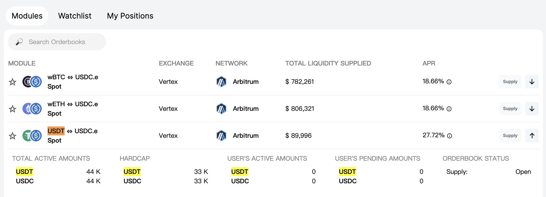 Elixir 上的 USDT/USDC 现货交易对目前 APR 为 27.72% ,流动性只有 9 万美元。但 APR 中有 15% 是 ARB 奖励,所有交易对一起计算,即增加这个交易对的流动性不会导致这一部分奖励被大幅稀释,其余部分奖励为锁定的 VRTX。