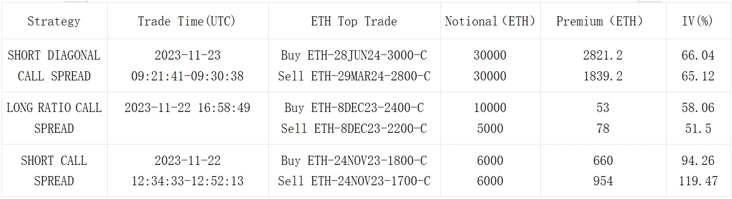 数字货币方面,市场已经快速消化了 BN 事件带来的风波,BTC 价格从 36000 下方逐步 反弹回到了近期高点 ,并一度挑战 38000 关口,ETH 也一路反弹走高,来到接近 2100 的位置;期权方面, BTC 隐含波动率水平整体微涨 ,大量集中在前端的交易使得该部分涨势更为显著,这些成交主要由 24 Nov 上的 Put Spread 买入 和 8 Dec 40000-C 单点接近 1000 BTC 的大宗买入开仓构成。ETH 的成交分布更多集中在远期,其中卖 29 Mar 2800-C 买 28 Jun 3000-C 的三角价差策略成交总量达到了惊人的 30000 张 ETH Per Leg。