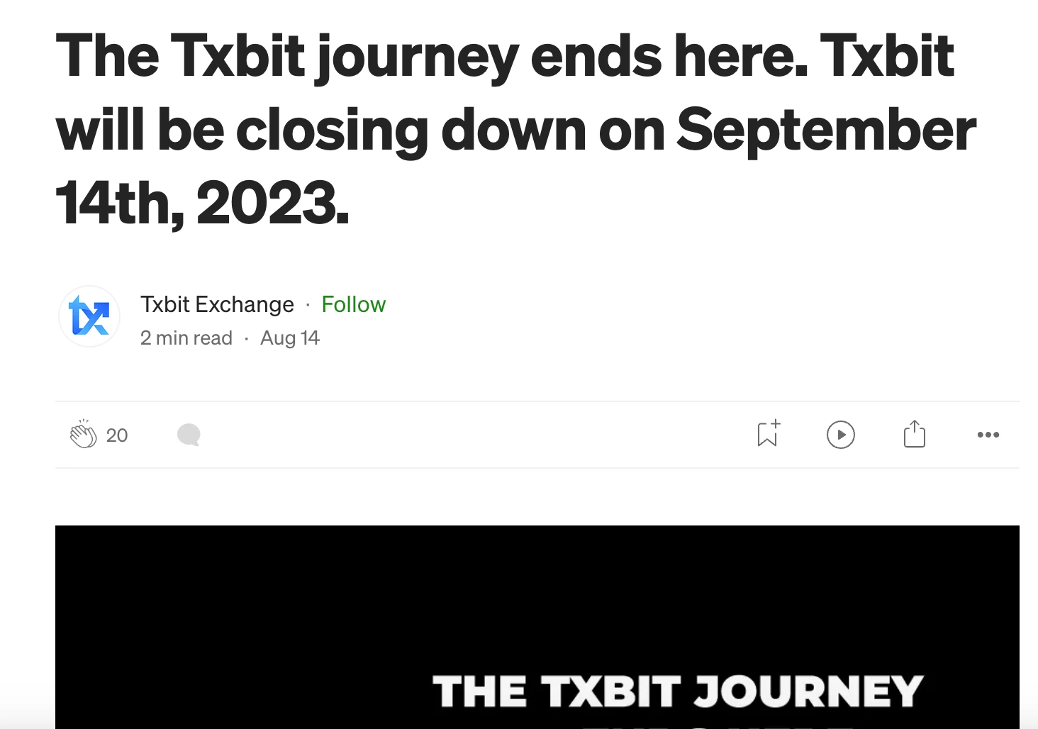 但好景不长, 8 月 14 日, Txbit 宣布将于 2023 年 9 月 14 日关闭,突然的消息让所有人措手不及,但好在 Txbit 并不是直接恶性跑路,用户只需在 9 月 14 日 之前提取资金即可。