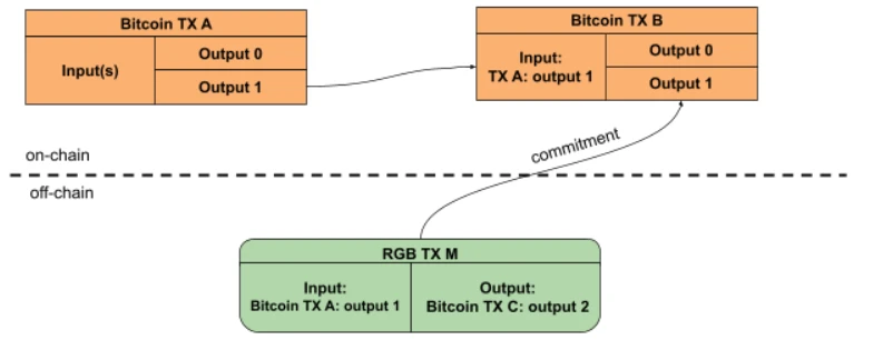 RGB的基础层是比特币区块链,包括Nakamoto PoW共识和交易账本。虽然不需要在链上存储任何数据,但仍需要遵循现有的基础设施,并利用比特币交易作为这些承诺的存储。