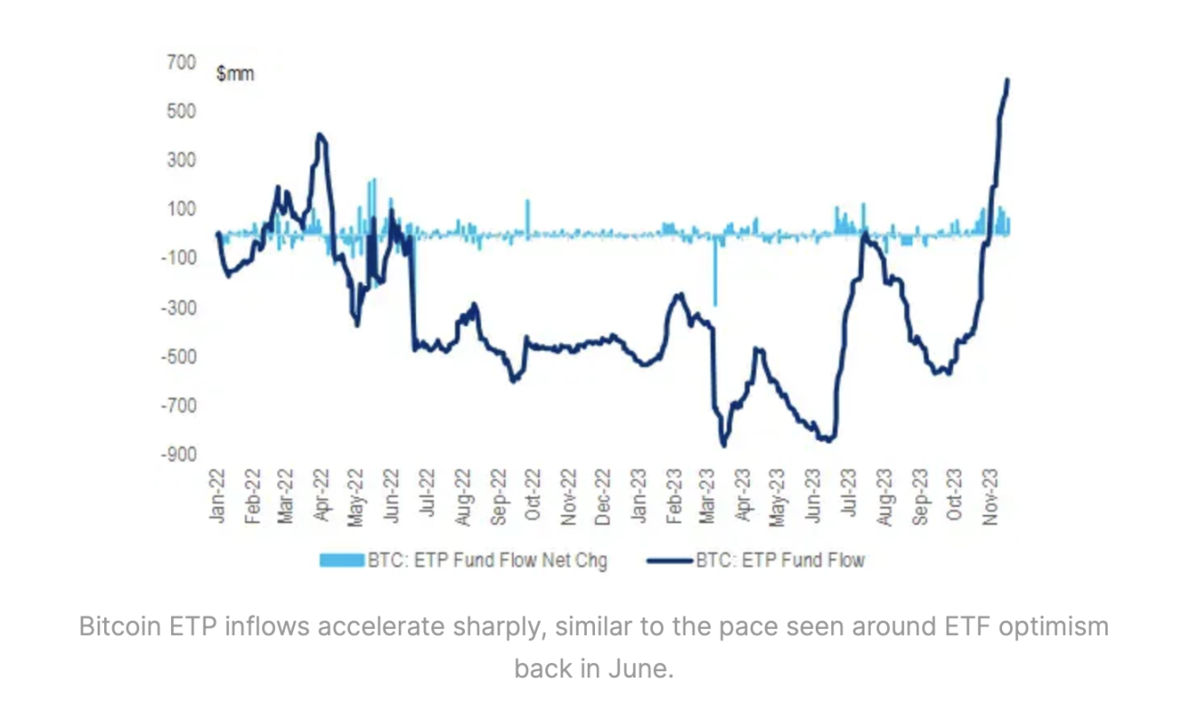 当 6 月份开始有 ETF 审批的猜测时,流入比特币交易所交易产品(ETP)的资金额度大幅加快。对 SEC 审批的新一轮乐观情绪引发了另一轮的资金流入,这些流入的增长速度甚至比上一轮更快。值得注意的是,资产经理购买比特币期货的速度已明显提升。这在 ETH 期货活动中也得到了证实。对比特币 ETF 的需求也在 SEC ETF 批准的错误报道后加密货币的急剧上涨中得到了证明。然而,基于 ETF 审批将解锁的比特币需求的范围是高度不确定的。这种不确定性只会在审批进一步延迟的情况下增加。有可能已经有能力获取 BTC 的投资者正在为批准做准备,一旦 SEC 获得批准,就将出售他们的比特币。