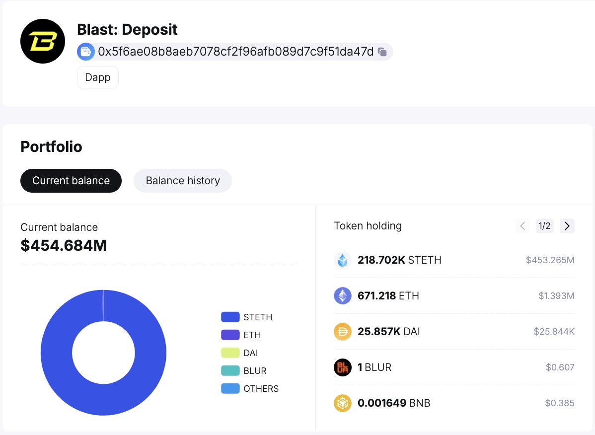 ETH存入Blast网络已达4.55亿美元,排名前10储户占比26%