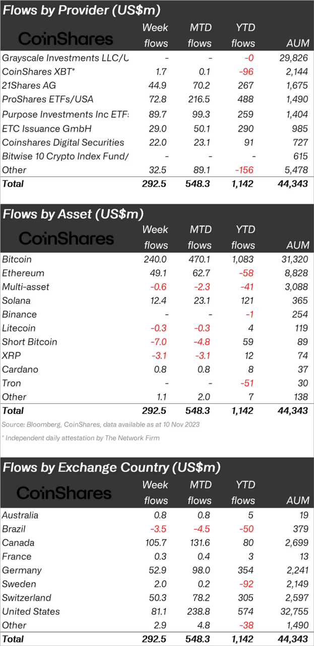 CoinShares 在 11 月 13 日发布了最新周报*,强调了资金重新流入比特币和山寨币的叙事。随着美国首个 ETF 可能获得批准的兴奋情绪升温,比特币、以太坊和部分主要山寨币正在经历价格上涨。