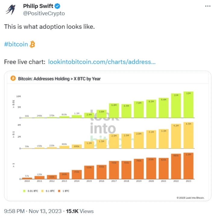 该周报包括了多个图表,上图显示了长期持有者(LTH)的比特币供应存储,即持有代币 155 天或更长时间的实体 。统计平台 Look Into Bitcoin 的创始人 Philip Swift 强调,无论大小,钱包实体的存在都在不断增加,并在 13 日发推表示,“这就是采用的样子”。