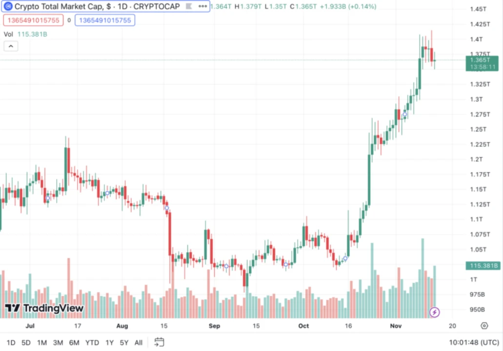 根据 TradingView 的数据,自 2022 年 11 月以来,整个加密货币市值已增加了 6000 亿美元。正如 CoinShares 报告里所详述的那样,过去两个月里,用于加密货币投资产品的资金大幅增加。该报告披露:“上周数字资产投资产品的资金流入总额为 2.93 亿美元,推动了为期七周的资金流入突破 10 亿美元大关。 今年迄今的流入总额为 11.4 亿美元,创下有纪录以来第三高的年度流入额。”