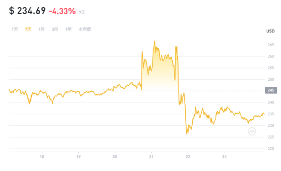 据数据提供商Nansen数据,受用户资金安全的影响,24小时币安交易所的净流出额超过 6.5 亿美元。尽管如此,作为龙头老大的币安,价值坚挺度仍不可小觑。与之对比的是,一年前竞争对手交易所FTX 倒闭时,资金流出高达60亿美元。从平台币BNB走势也可见一斑,尽管受此消息影响下跌14.5%,但此后再度回升,现报236.69美元,7天仅下降4.33%。