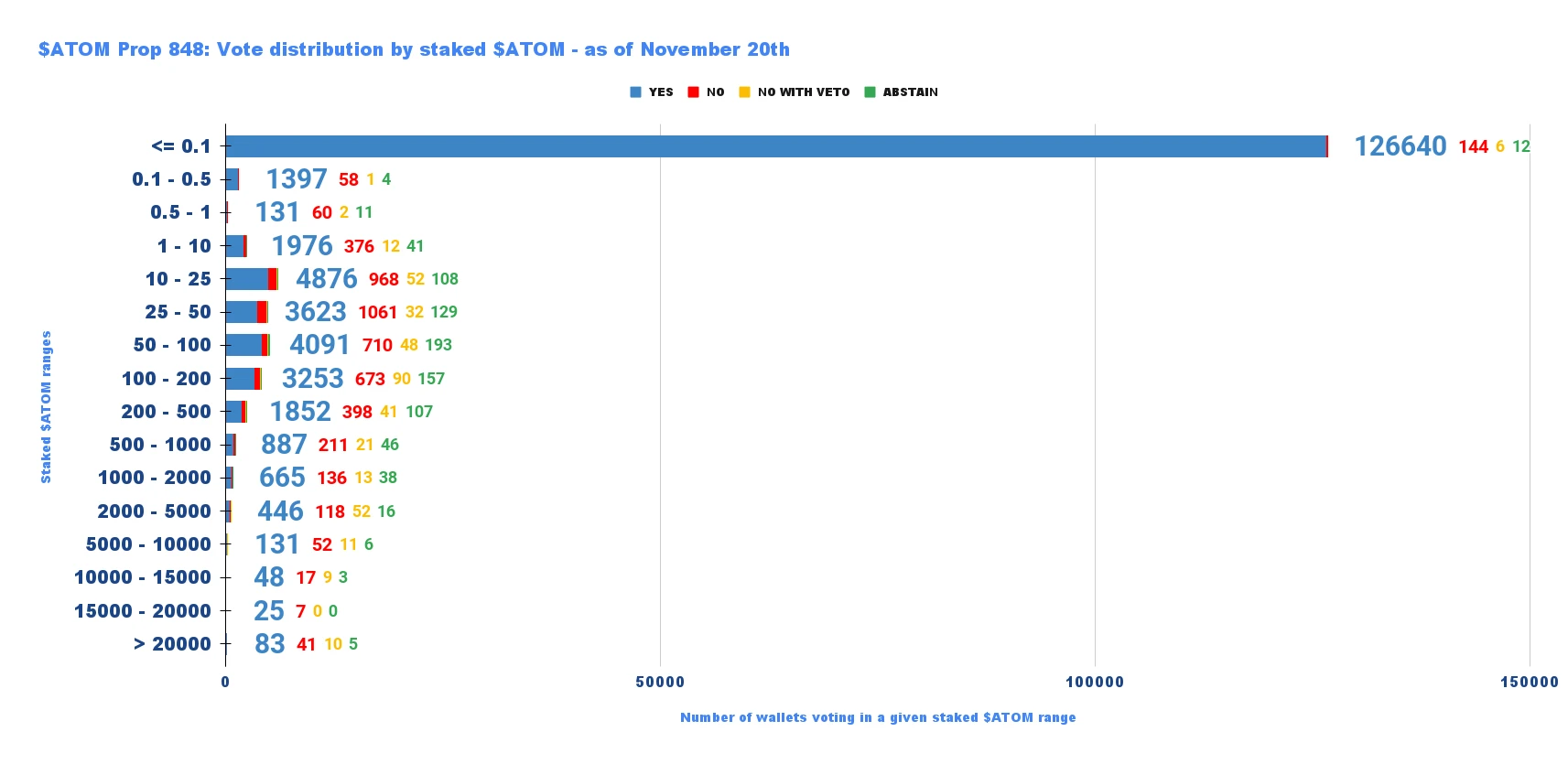 和上述投票结果形成对比的是投票人数的支持比例,虽然对于 PoS 公链,这一条件并不影响投票结果,但可以在一定程度上反应支持者的人数占比。在所有投票的 17.3 万个账户中, 16.4 万个选择了支持,占比 94.97% 。也有人指出,投票账户中,有很多质押 0.1 ATOM 以内的账户参与投票,并选择了支持,导致支持的账户比例看起来很高,这一部分账户可能来自空投猎人。但据不完全统计,在各个持币区间内,投票中的支持账户数都多于反对票数。例如,在投票的 143 个验证者中,支持比例 54.55% ,反对比例 27.27% ,否决比例 0.7% 。