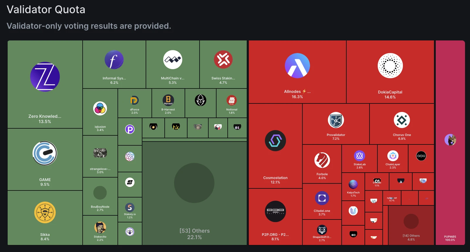 投票结果更多的还是受验证者的影响,总的 7316 万 ATOM 支持票数中有 7043 万 ATOM 来自验证者,ZKV、GAME、Sikka 等验证者选择了支持,Allnodes、DokiaCapital、 Cosmostation 等验证者选择了反对。需要注意,验证者的票数中会默认计入其他用户委托给该验证者的 ATOM。如果用户不同意该验证者的投票,也可以选择自行参与投票,覆盖掉验证者的投票结果。