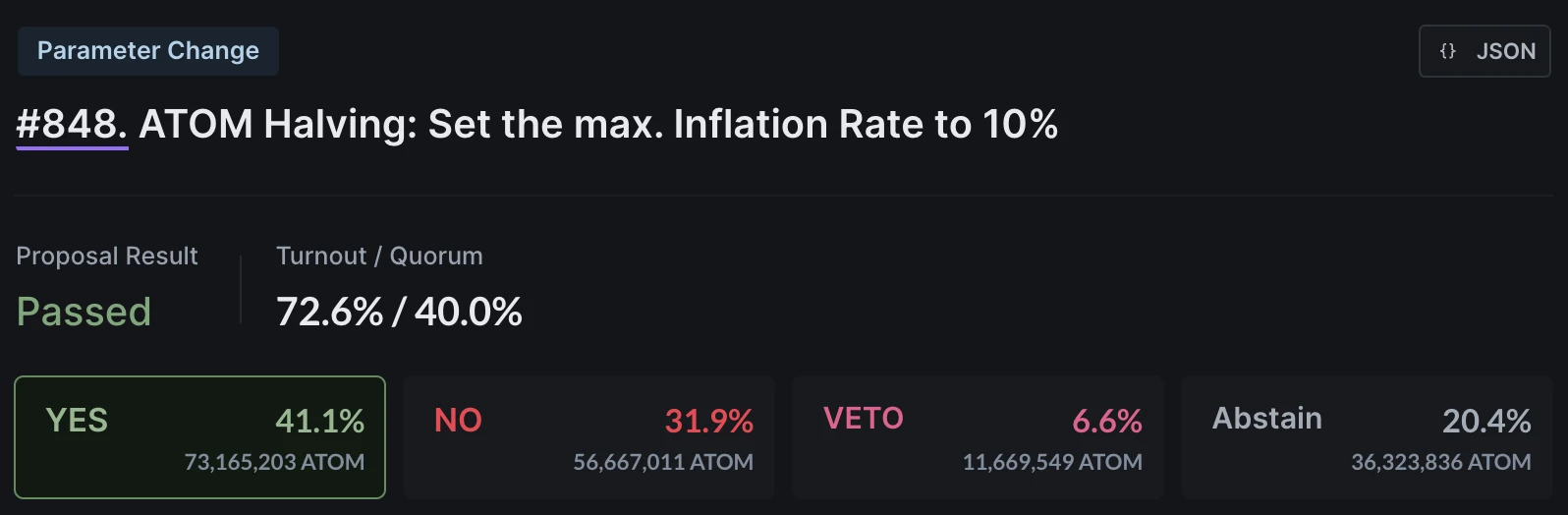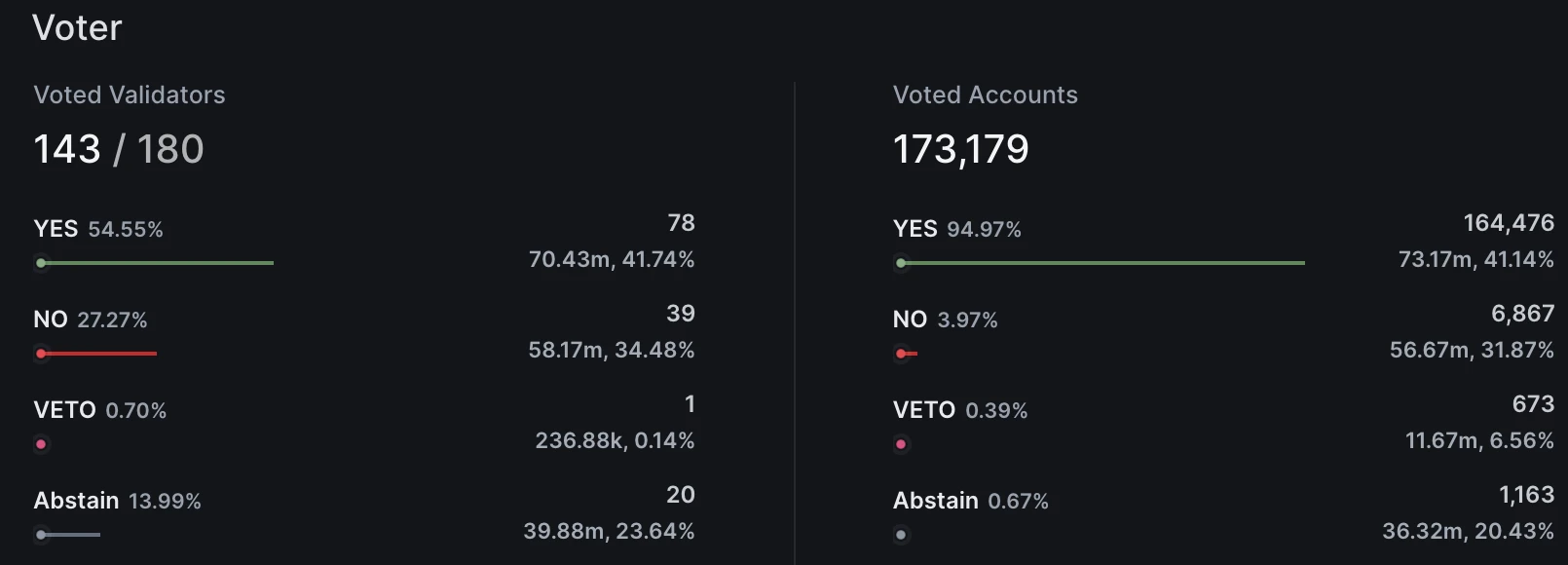 该提案最终在 11 月 26 日结束投票,以微弱的优势获得通过。按参与的 ATOM 数量计算,投票率达到了 72.6% ,赞成比例为 41.1% ,反对比例为 31.9% ,否决比例为 6.6% ,弃权比例为 20.4% 。