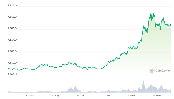 除此之外,Cosmos 生态的 Kujira TVL 自 9 月以来最高也增长逾五倍, 两个多月即从 1600 万美元附近狂飙至 8000 万美元以上,速度堪称惊人,而其Token KUJI 也在三个月内涨幅近 400%,俨然有黑马之姿。
