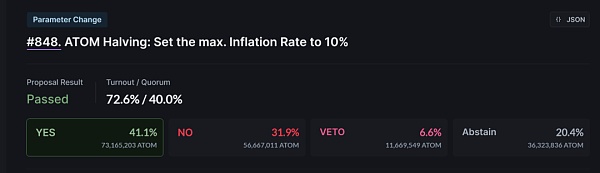 11 月 26 日,Cosmos Hub 社区经过惊险的投票反转,终于在最后时刻通过 「ATOM 减产:将最大通胀率设置为 10%」 提案,这也意味着 ATOM 最大通胀参数将从 20% 降低至 10%,使 ATOM 当前的通胀率降至 10%,并将 staking 年利率从 19% 降至 13.4%。