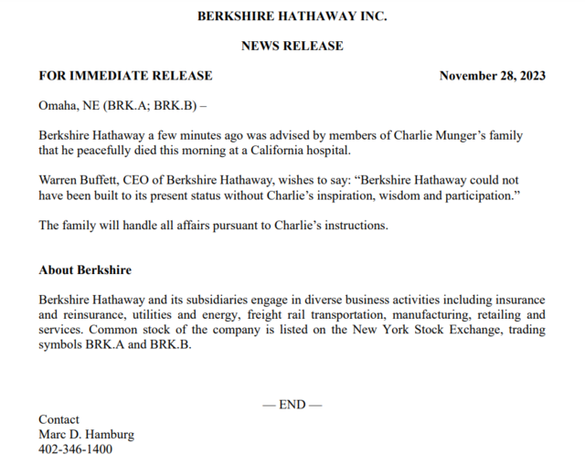 伯克希尔哈撒韦公司正式公告:当地时间 11 月 28 日上午,查理·芒格(Charlie Munger)在美国加利福尼亚州一家医院安详地离世。