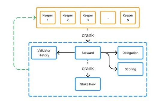 Jito StakeNet 将被设计为一个自发展、透明和去中心化的协议,用于运营智能质押池,其核心是一个由守护者(keeper)和链上程序组成的网络。