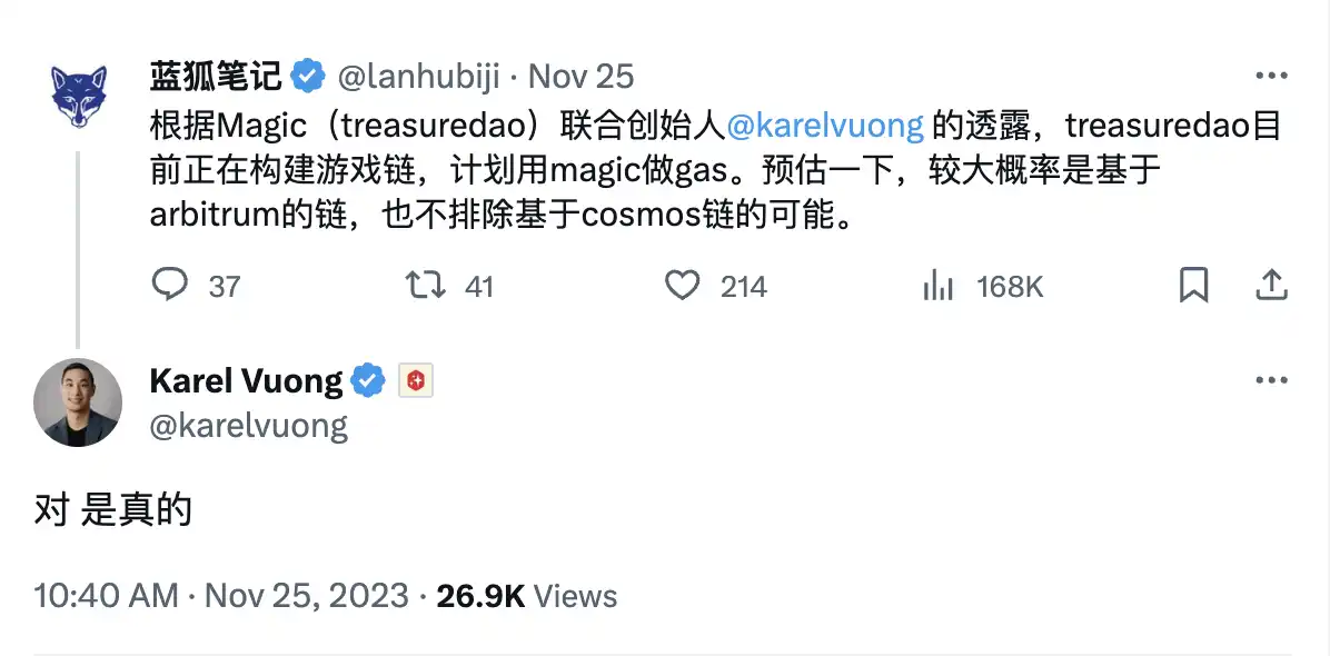 11 月 25 日,加密 KOL 透露称 TreasureDAO 团队正在开发自己的区块链,旨在打造专门的游戏生态平台。这条区块链有可能会基于 Arbitrum,也有可能会基于 COSMOS,这条消息一经披露就被 TreasureDAO 的联创 Karel Vuong 所确认。