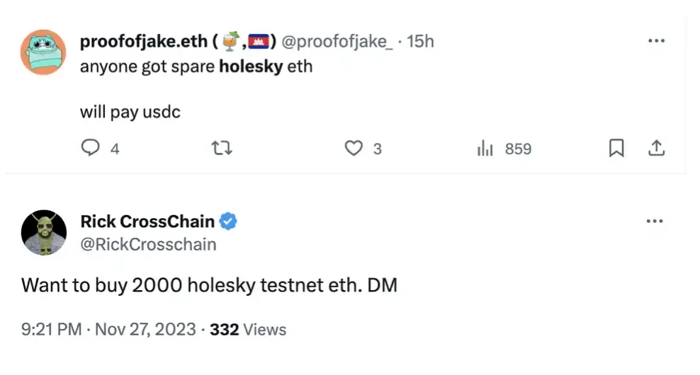 据社区反馈,Sky Strife 的测试代币一个只需 0.3 RMB,但现在一张 pass 卡差不多要 3000 人民币,用户直言道「牛市测试网也没见过这样的」,社区里也出现很多人场外收 holesky 的 ETH 以进行游戏试玩。