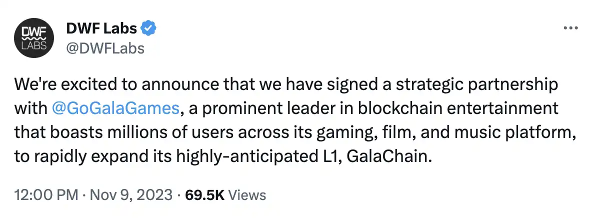 11 月 9 日, DWF Labs 宣布与以太坊生态链游平台 Gala Games 签署战略合作伙伴关系,以加速其 L1 GalaChain 的采用。