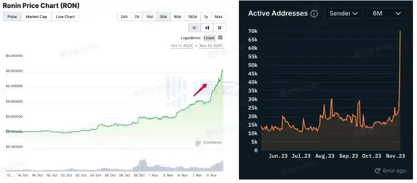 Ronin 代币价格及网络活跃地址数量均在 Pixel 加入生态后迅速增长;图源来自 CoinGecko