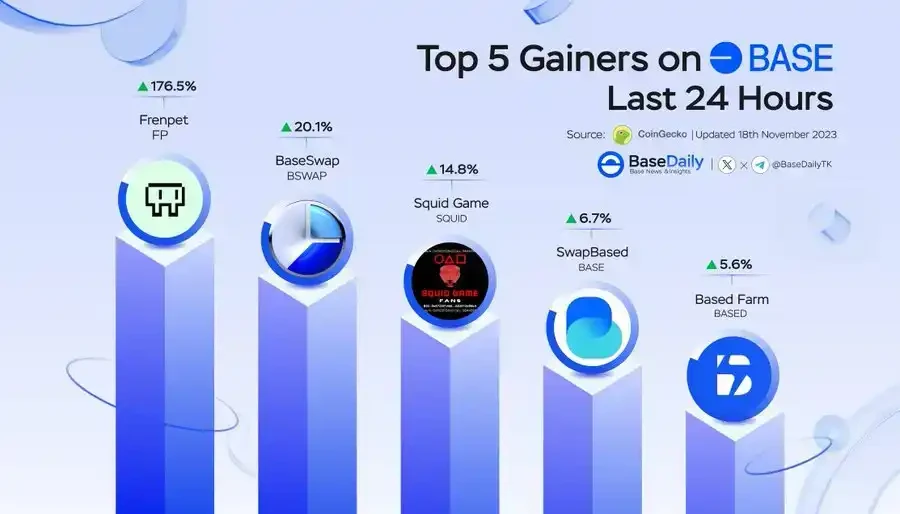 11 月 18 日 Base 链项目 TVL 总量变化,FrenPet 稳居榜首;图源来自 CoinGecko
