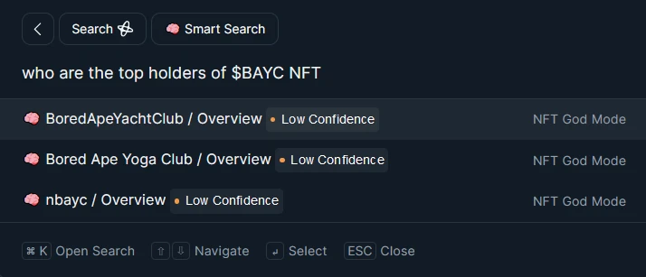 对示例的问题 1 和问题 2 进行组合提问测试:“who are the top holders of BAYC(BAYC 的顶级持有者)”,然而 Nansen 指向的答案却指向了代币方面。