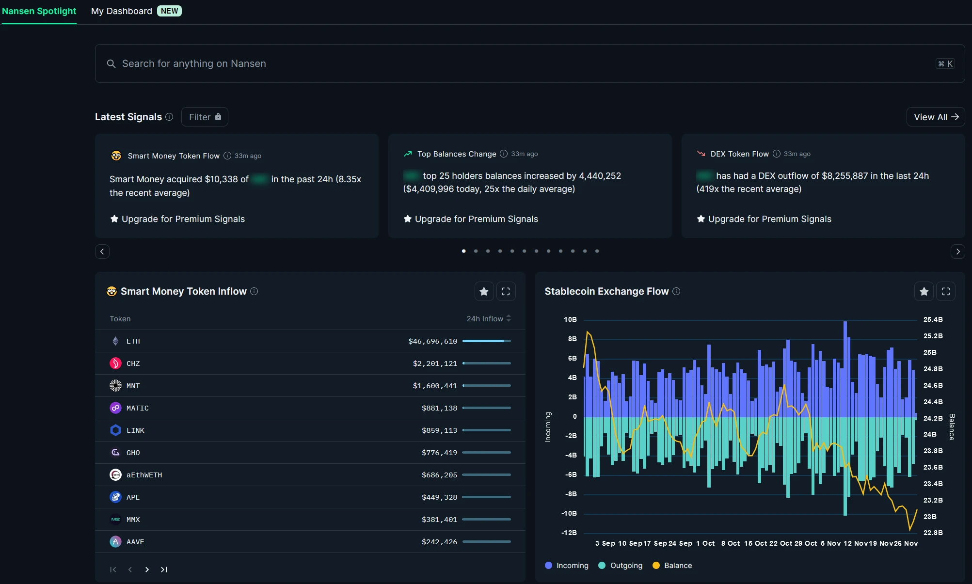 标准 Nansen Dashboard 如下,包括搜索、Signals、 Smart Money 动向、稳定币和 ETH 的交易所流动情况。
