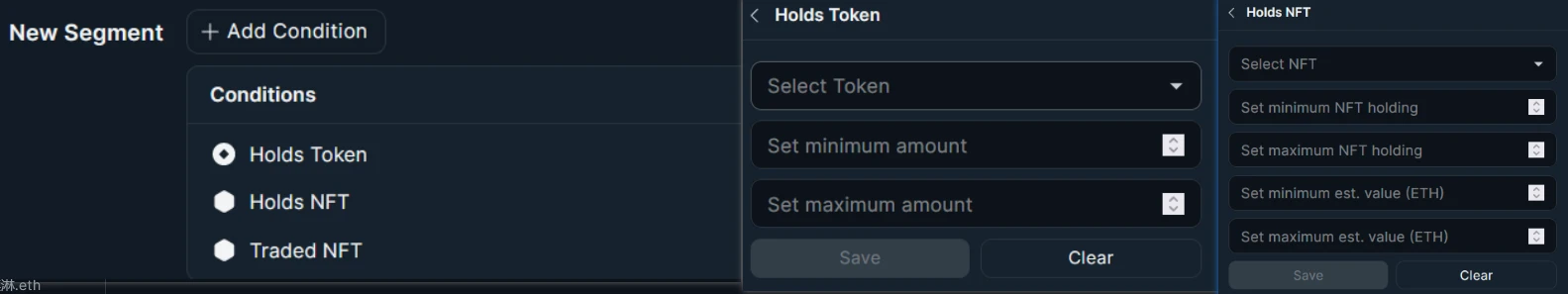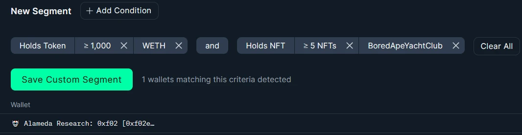 例如可以选择持有 1000 枚 WETH 且持有 5 枚以上 BAYC 的地址: