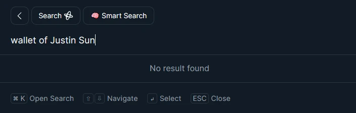 本次的查询问题为“wallet of Justin Sun (孙宇晨的钱包地址)“,查询结果为空。