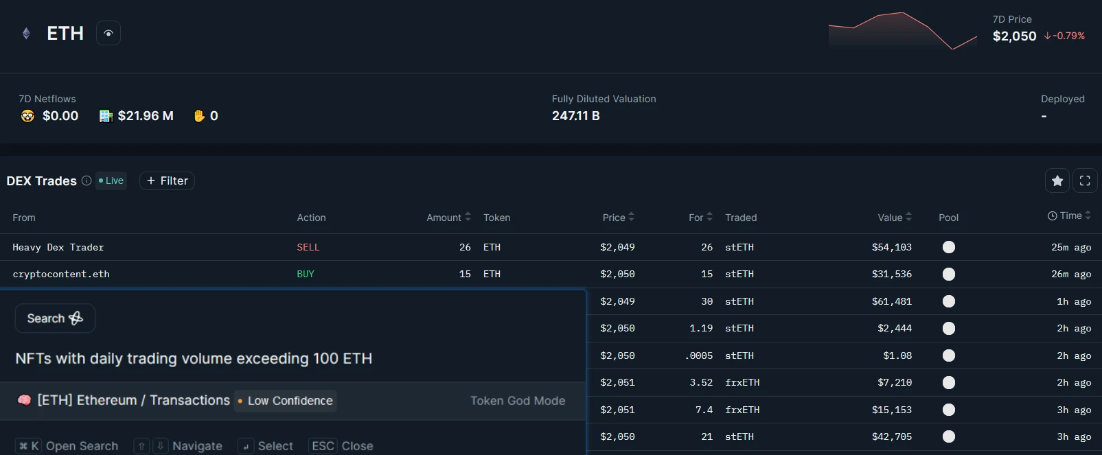本次的查询问题为“NFTs with daily trading volume exceeding 100 ETH(日交易量大于 100 ETH 的 NFT)”,反馈的结果为 ETH 的交易情况。